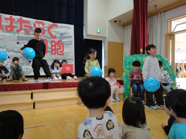 各クラス、舞台を使っての練習が行われていました。初めてちゅうりっぷさんの劇を観ましたが、いつの間に練習したのでしょうか、セリフもしっかりと大きな声で言えていて驚きました。何といっても『働く細胞』は子どもたちが自分たちで決めただけあって、みんな役になりきって行っていました。インフルエンザに罹ると、私たちの体の中でどんなことが起きるのかを教えてくれる劇なのですが、こんな難しいものが流行るんですね~。すごいなぁと思って見ていました。
