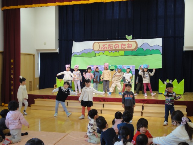 昨日できなかった『ぶたのたね』の総練習をしました。ぶたのたねを植えたらぶたが生るという発想が何度聞いてもおもしろいですね。そうだったらいいな、でも実ったと思ったら走っていなくなっちゃうんだったら困るなぁなんて思いながら見ていました。子どもたちも楽しく演じている姿が、見ていてとても嬉しいです。