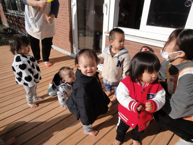 お部屋でゼリーの感触遊びをしていたつぼみさんがテラスに出てシャボン玉で遊んでいました。すのこは、もうそろそろ片付けないといけない時期になってきていますが、渇いていないと片付けられないので困っているところです。ひょっとしたらすのこで遊べるのは今年度最後になるかもしれませんよ。