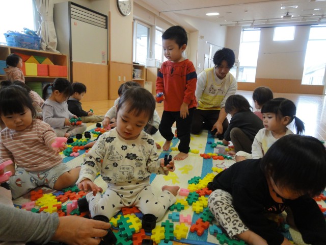ちゅうりっぷさんは好きなおもちゃで遊んでいました。カードゲームをしていたり、神経衰弱やカルタ、パズルや紙コップ並べなどそれぞれ、お友だち数人と遊んでいました。紙コップを交互に積むのではなく、一個の上にもう一個と積み上げているお友だちがいました。せいぜい4個が限界では?と思って見ていたら、5個積み上げることに成功!これにはお友だちも驚いていましたよ。自分で考えて遊びを発展させていておもしろかったです。