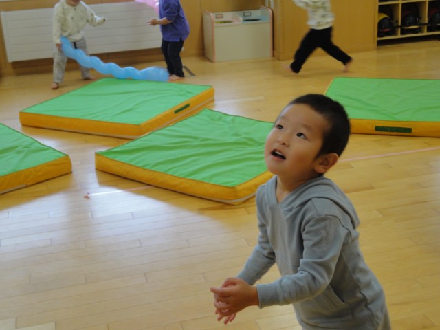 たんぽぽさんは、ボール入れゲームで楽しんだ後、バルーンで遊びました。お尻をつかずにしゃがむとか、バルーンを持つときは上からつかむなどと先生の指示を聞いて行うことはなかなか難しいことです。バルーンを持つとすぐに動かしてみたくなるようで、バサバサと音を立てていましたよ。
