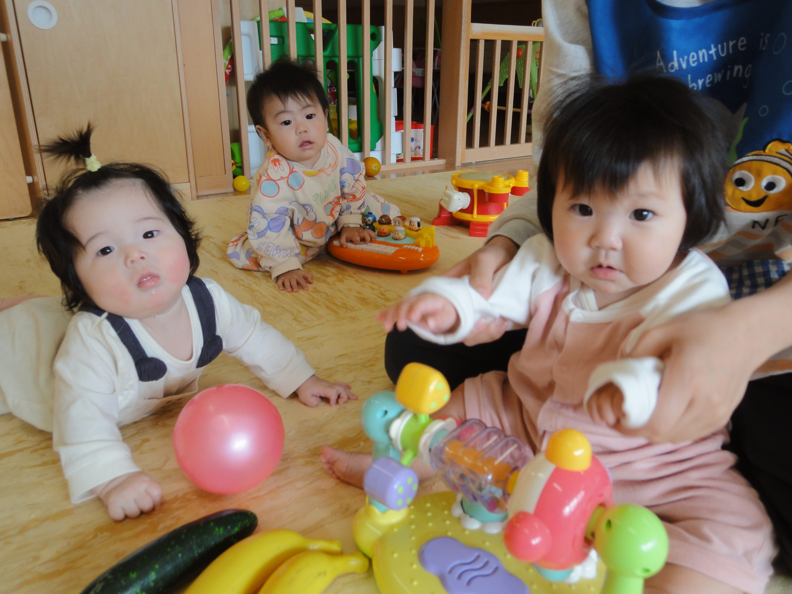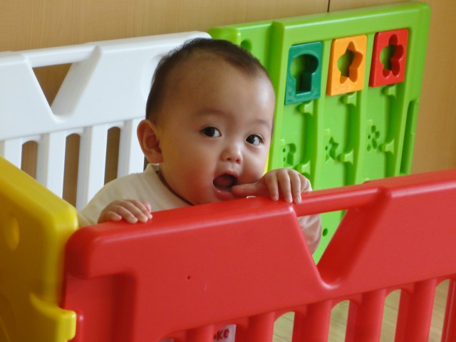 つぼみさんのお部屋を覗いてみると、つかまり立ちをしている赤ちゃんがいました。しばらくお休みが続いていたのですが、久しぶりに登園すると人見知りが始まり、担任以外の先生を見ると泣いてしまうのだそうです。そんな中、さっと撮った一枚です。この次の瞬間には泣き出しましたよ。