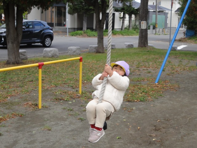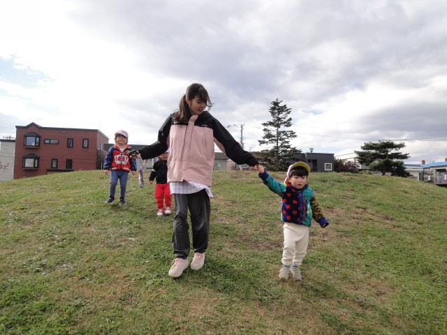 たんぽぽさんは菊水小学校の隣のしらかば公園まで行ってきました。公園の小山は少し急な勾配で降りる時に「怖~い」と言って一人で降りられないお友だちがいました。最初は先生に両手をつかんでもらって降りていましたが、何度か登り降りしているうちに片手だけで降りられるようになりましたよ。