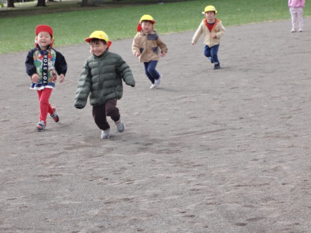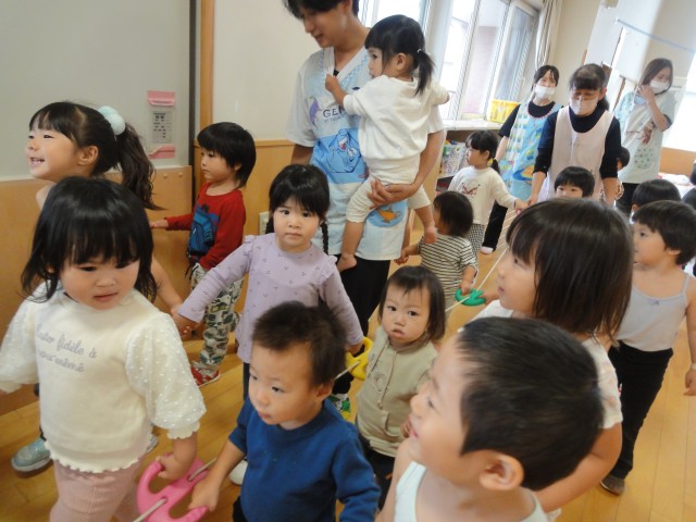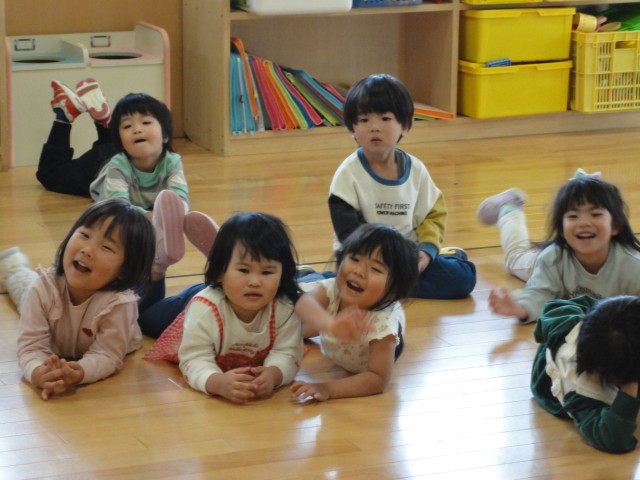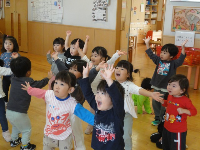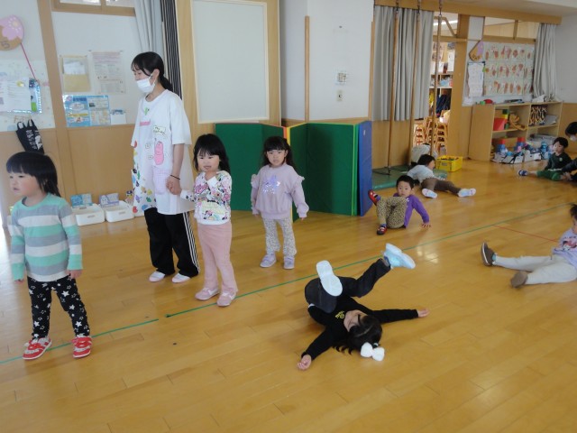 保育園では、すみれさんがホールで曲が流れている時に走って、曲が止まったら止まるというゲームをしていました。なぜか曲が止まったら、足を上げたり変な格好で止まるんですよ。おもしろかったです。下ではたんぽぽさんが、お遊戯の練習を行っていました。初めて行ったとのことでしたが、みんなノリノリで先生の真似をして踊っていて、とっても楽しそうでした。体を動かすことは、子どもたちにとって、とても楽しいことなんですね。