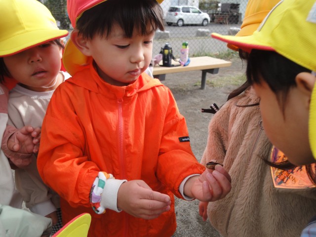 舞鶴公園に行ったすみれさんもボールを追いかけ、右や左といっぱい走っていました。疲れたお友だちが集まってきて、拾ったドングリを見てみると、穴が開いていて中にはダンゴ虫がいました。「これ、ダンゴ虫のおうちだ」とみんなで観察していましたよ。