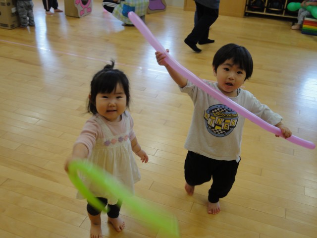 たんぽぽさんは風船で遊びました。波になっている細長い風船を投げてキャッとしてみたり、剣として戦ってみたりしていました。丸い風船もあり、自分で上に投げてキャッチするということもしていましたよ。