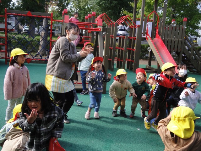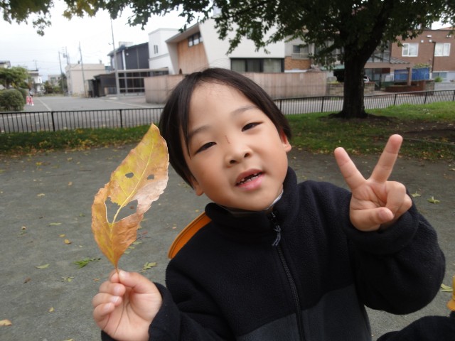落ち葉遊びが楽しい季節がやってきましたね。ちゅうりっぷさんはことぶき公園でおにごっこをしたり落ち葉で遊んだりしていましたよ。落ち葉のお面、良いですね。