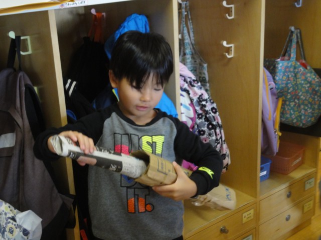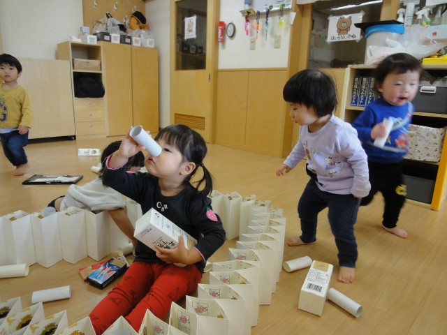 つくしさんでは、牛乳パックやお菓子の空箱などを使って積み木のように重ねたり、並べたり、覗いたりしていました。あれれ?目で覗くのではなくて鼻に当てているお友だちがいますよ。かわいい間違いですね。