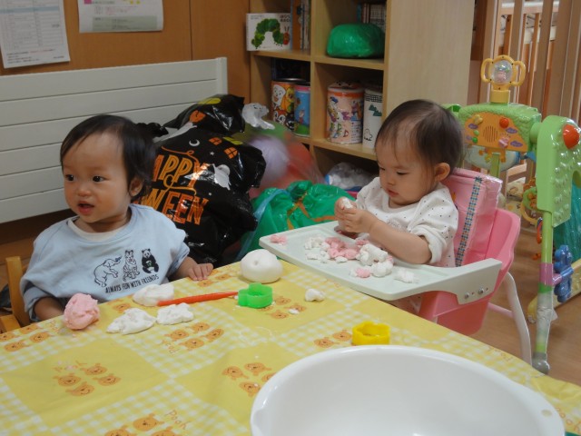 つぼみさんは米粉粘土で遊びました。色々な色も付けて、色と感触を楽しんでいました。小さくちぎることもできるんですよ。柔らかくて気持ちの良い触り心地でしたよ。