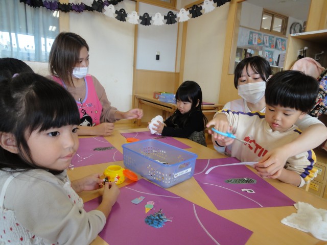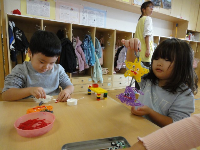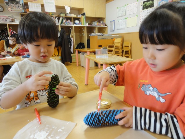 すみれさんは、この間色を付けいていた松ぼっくりに、ボンドで目や手足を付けて、モンスターを作っていました。目の位置で表情が違うので、おもしろいモンスターができ上っていましたよ。どのクラスも楽しい遊びがいっぱいでした。