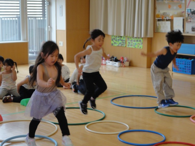 ホールではさくらさんが体育遊びをしていました。ボールをフープに入れて引っ張っていく競争や、輪の中を両足飛びで飛んでいく競争をしていました。両足飛びというのが少し難しかったようで、焦ると片足飛びになったり、駆け抜けたりしていました。