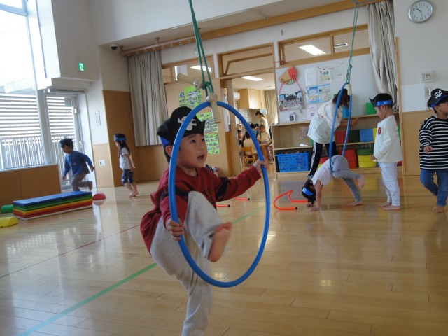 すみれさんは、ホールで海賊のお面を付けて、サーキットで遊んでいました。こちらも海賊になりきって、飛び石や平均台はから落ちるとワニに食べられちゃうと言いながら落ちないように気を付けて渡っていましたよ。