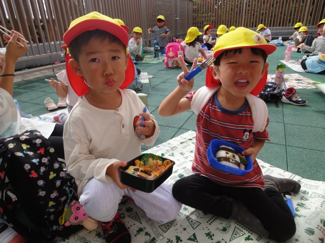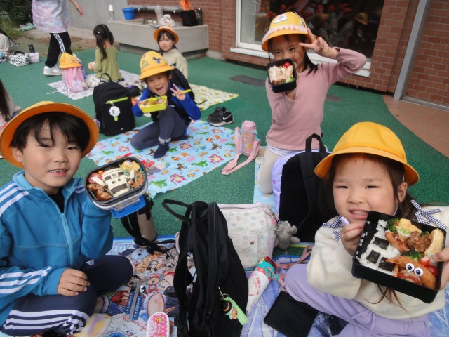 さて、今日はお弁当の日だったので、ちゅうりっぷさんとさくらさんは園庭でシートを広げていただきました。すみれさんは、テラスでいただきました。10月はハロウィンということで、ハロウィンに因んだカボチャやおばけの装飾のお弁当が多かったですね。おうちの方の気持ちが伝わってきて、とっても嬉しい気持ちになりました。朝早くから作っていただき、ありがとうございました。