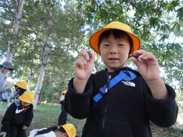 今日も良い天気になったので、お散歩に出かけるクラスが多かったです。ちゅうりっぷさんは、北郷西公園に向かって行きました。公園の少し手前には栗の木があって、栗拾いができました。あらかた拾われた後でしたが、それでも、ビニール袋いっぱいになりました。時々栗のイガで痛い思いをしますが、上手に足で開く術も身につけています。何事も経験ですね~。