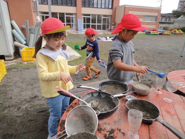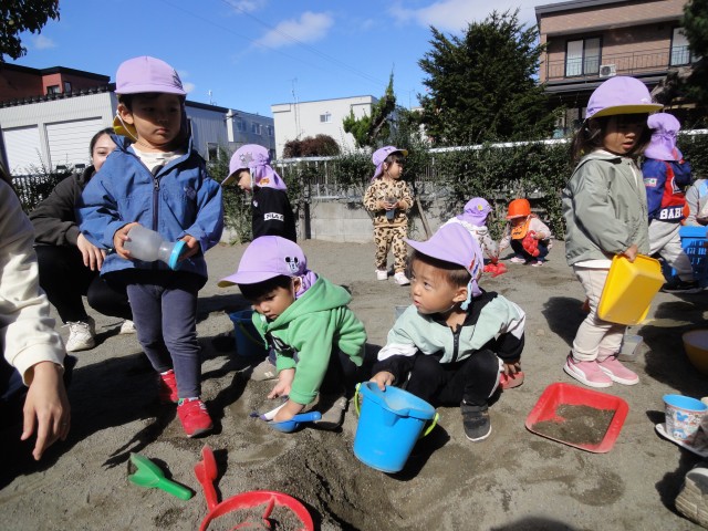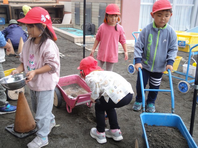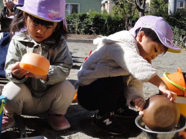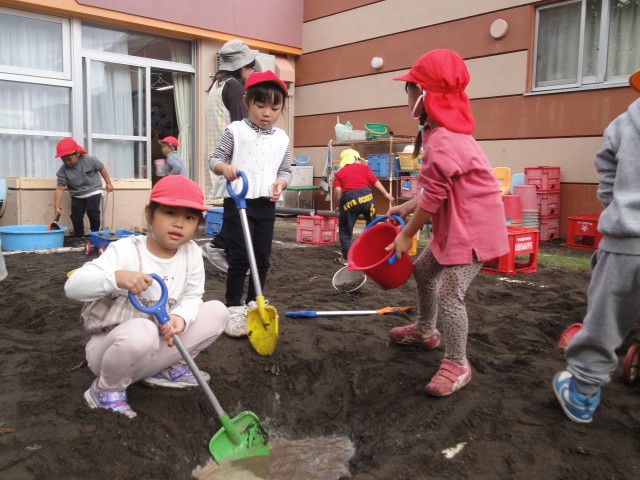 最高気温15度、10月末の気温とのことでしたが、思いがけず日差しもあって寒くなく外遊びができました。今日は、さくらさんの幼稚園交流日で、幼稚園の園庭で、思い切りどろんこ遊びを楽しんできました。交流といっても、うちの園児の人数が倍なので、独占して遊んでいるようでした。スコップで穴を掘ったり、お玉で泥水をコップに注いだり、手押し車に土を積んで運んだり…思い思いの所で遊び込んでいるようでした。塩ビ管に水を流す装置の所では、塩ビ管の接続がうまくできていないと流れないとか、高低差がないと流れないということを何度も実験しながら自分たちでうまく流れる方法を見つけていましたよ。