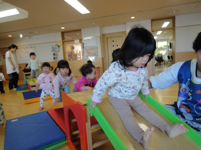 つくしさんは、半数がお部屋で透明スライムで遊び、半数が組み立て遊具で滑り台をして遊びました。10名ほどずつ分かれて行うことで、ゆったりと余裕をもって遊ぶことができるようでした。