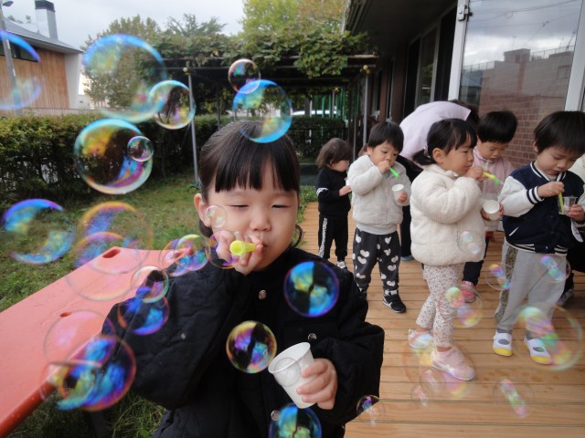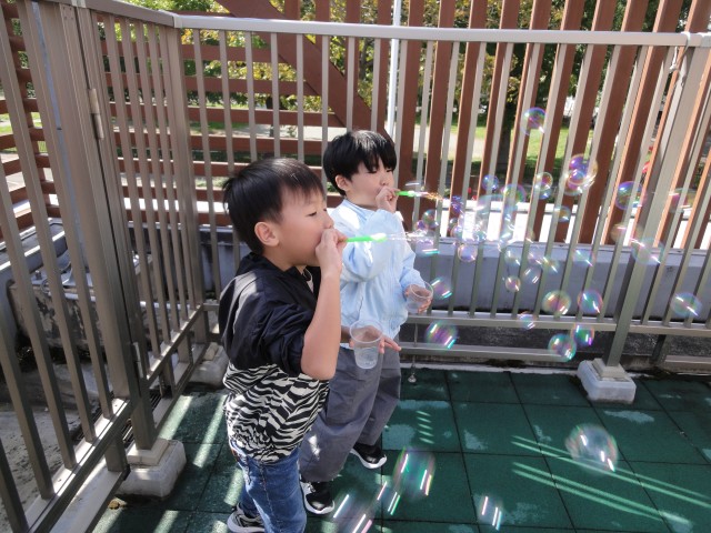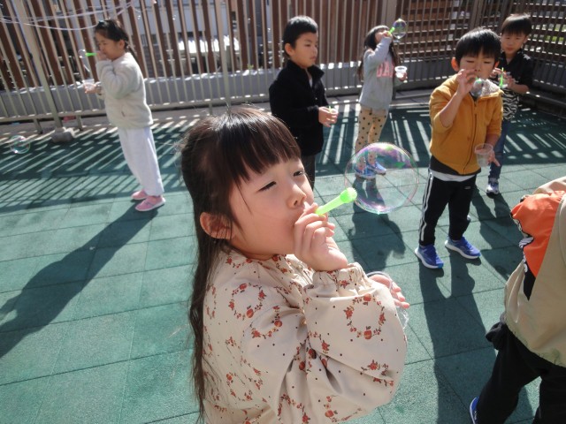 たんぽぽさんはシャボン玉をしていました。上手に吹いてたくさんのシャボン玉を作っていましたよ。うまくできなかったお友だちも何度かやっているうちにできるようになっていました。