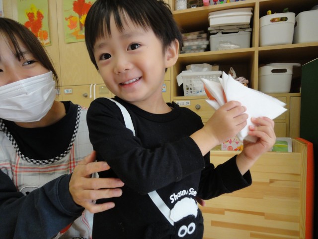 すみれさんはお手玉を使ってわらべ歌を歌っていました。昔ながらのわらべ歌…知っている先生が少なくなってきているのではないでしょうか?うちにはそんな歌も教えてくれる先生がいて素敵だなと思って見ていました。さくらさんは、段ボールと新聞紙を自由に使って遊んでいました。新聞紙を小さく切って丸めて「納豆巻」と教えてくれるお友だちもいました。