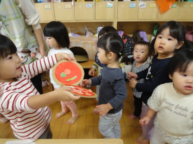 たんぽぽさんのお部屋では、ピザ窯が何個も設置されていて、机の上にはケチャップを塗ったピザが用意されていました。子どもたちは好きな具をトップングして、ピザ窯に入れてピザを作っていました。ラーメンも好きな具をのせて「どうぞ」と見せてくれていましたいよ。サンドイッチもトマトやレタスなどを挟んで作っていて、みんなとっても楽しんでいました。