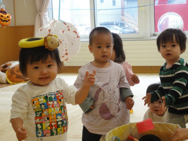 つくし・つぼみさんは、ホールで遊びました。壁にテープのくっつく面を上にして貼り、そこにボールを投げてくっ付けるという遊びをしていました。でもさすがに投げてくっ付けるのは難しく、ボールを拾って手でくっ付けていました。しばらくすると、くっつけるより取る方がメインの遊びになっていました。先生がくっつけたボールを子どもたちがポンポンと取っていきます。それも楽しい遊びのようでした。