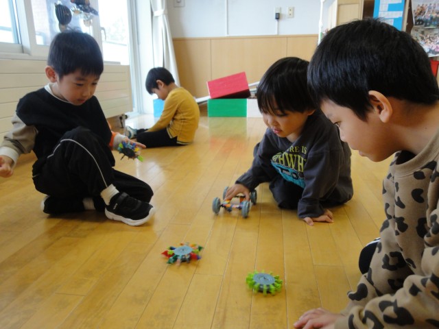 ちゅうりっぷさんは、好きなおもちゃで遊びました。男の子はブロックを組み立てて、『ベイブレード!』といって見せてくれました。クルクルと上手に回してお友だちと戦います。ぶつかって先に止まった方が負けかな?何度もお友だちと戦っていましたよ。