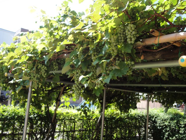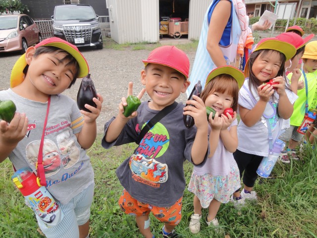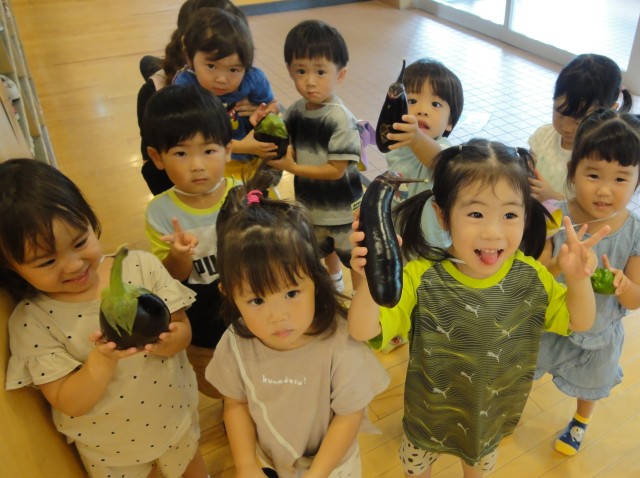 たんぽぽさんがなすびやピーマンなどを採ってきました。他のクラスが植えたものなのですが、収穫は自由に許されているそうで、ピカピカの笑顔で見せてくれていました。園庭のブドウも見事に大きくなってきて、小さいお友だちも指さして「ぶどう!」と言っていますよ。形はぶどうですが、おいしくなるまで、もう少し待ってね。