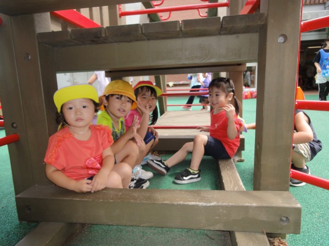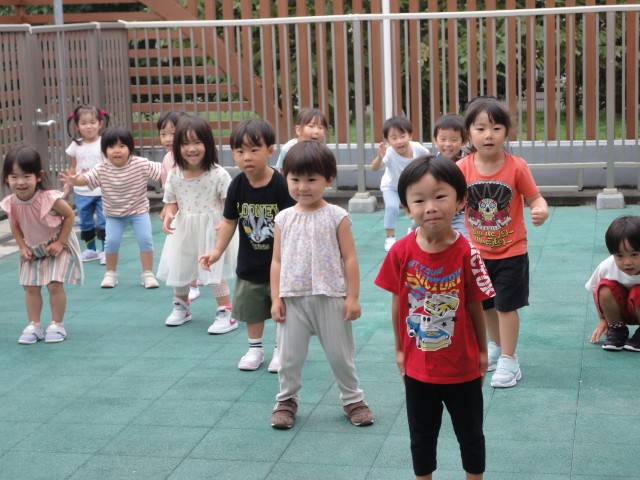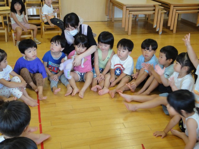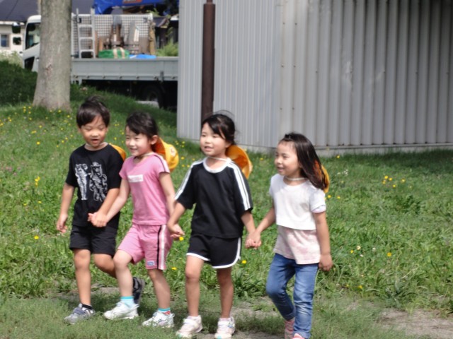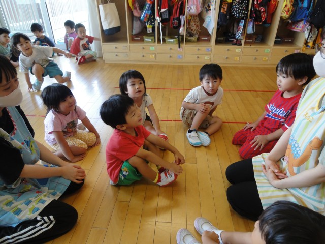 雷が鳴って雨交じりの朝でしたが、10時頃にはお天気が回復し、小さいクラスの子どもたちは、園周辺のお散歩に出かけて行きました。すみれさんは、お部屋で『かごめかごめ』を初めてしました。やりながらルールを説明していました。「後ろの正面、だ~れ?」とオニ役の子に尋ねると、直ぐに後ろを見ようとする子が続出。「見ないで声だけ聞いて当ててね」と先生に言われ、首をかしげる場面もありましたよ。お父さんお母さんも子どもの頃やったことがある昔ながらの遊び、伝承していきたいものですね。
