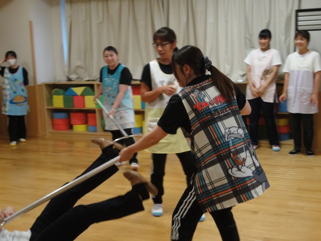 一昨日の子どもたちの防犯訓練を終え、昨日の閉園後に職員の防犯訓練を行いました。さす股の使い方もしっかりとお聞きし、ネットランチャーも実際に使ってみました。手をつかまれたり、胸ぐらをつかまれたりした時、どうやって逃げるかなどの護身術も教えていただきました。不審者対策は実際にやってみると色々と問題点が見えてきたので、この体験をもとに職員間で話し合い万一の時に備えていきたいと思います。
