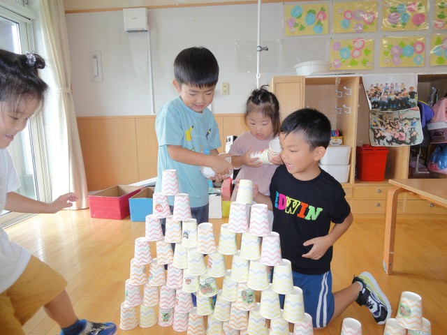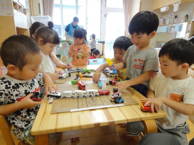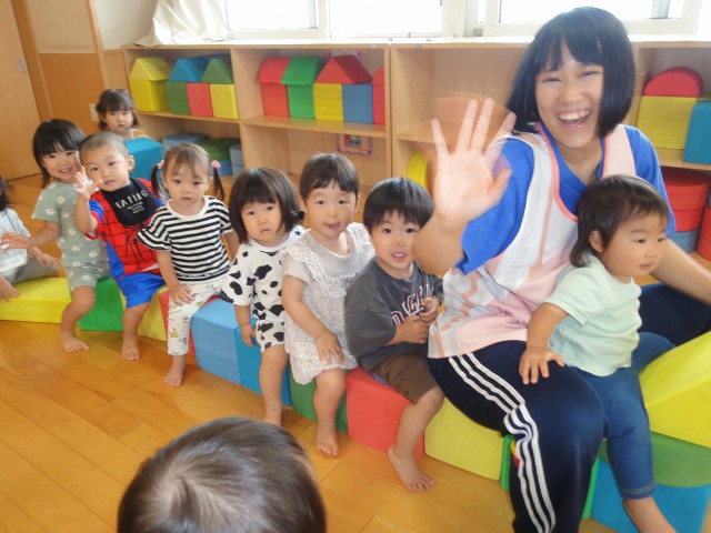 今日から9月。そう思うと吹く風も何となく涼しく感じます。でも、やっぱり、まだ暑い。そんな中、お散歩に出かけて行くクラスが多かったです。つくしさんはホールで、バスに乗って揺られていこうと歌を歌いながらバスごっこをしていましたよ。カラー積み木を並べるとバスごっこになるのが恒例です。こういう繰り返しが子どもたちには大事な遊びなんですよ。
