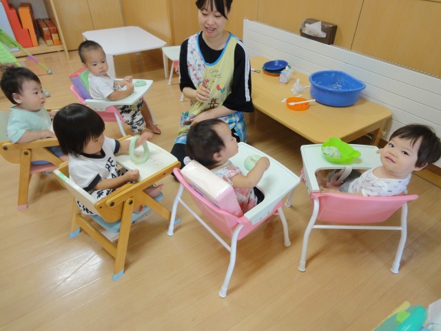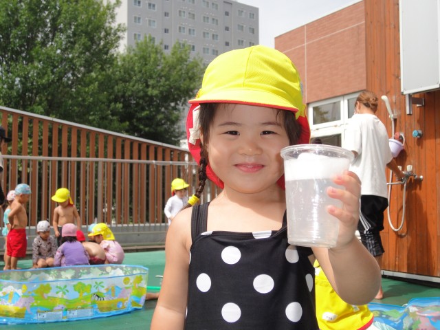さて、今日も暑くなりましたね。すみれさんは、水遊び&泡遊びをしました。泡立て器で泡を立てる方法を教えてもらい、一生懸命泡立てていました。そして上から見ると泡だけなのにコップに入れてみると、水の部分と泡の部分に分かれることがわかりました。遊びながら学んでます。