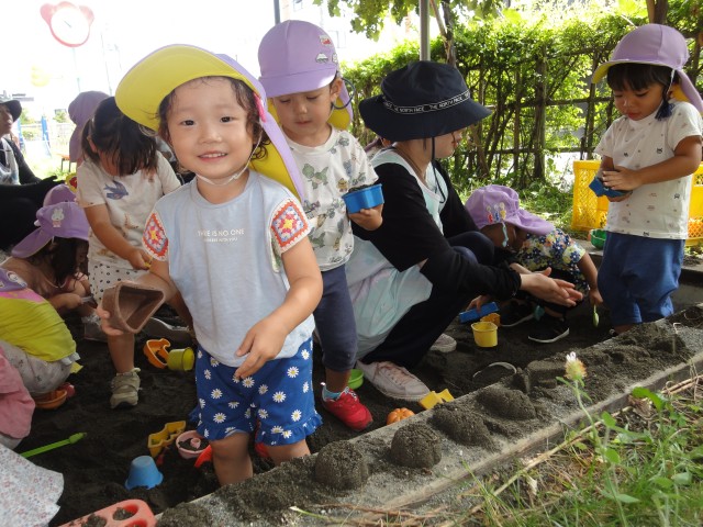 たんぽぽさんは砂場で遊びました。型に砂を入れてひっくり返してみると、アイスクリームだったり目玉焼きだったり、いろんな形ができます。でも、きれいな形にするには、びっしりと砂を詰めるのがこつです。うまくできると、とっても嬉しいお顔を見せてくれましたよ。そんなたんぽぽさんに混じって、つぼみの赤ちゃんが遊びに来ていました。静かに楽しんでいったようでした。