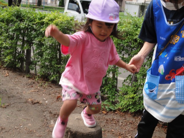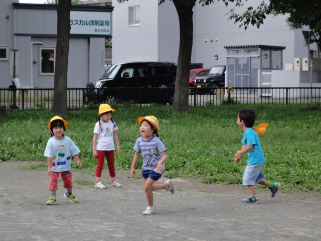ちゅうりっぷさんは、すずらん公園に行きました。公園でいつもの氷オニ(おにごっこ)をしていたのですが、先生に「手つなぎオニ、してみない?」と言われ、初めてやってみました。初めての事なので、タッチされると思わず両手を上げて氷オニの形になっていましたが、手つなぎオニは捕まったら一緒にオニになって追いかけるというルールです。時々手が離れてしまうこともありましたが、最後の一人を捕まえるまで、みんなで協力して追いかけていましたよ。いっぱい走りましたね。
