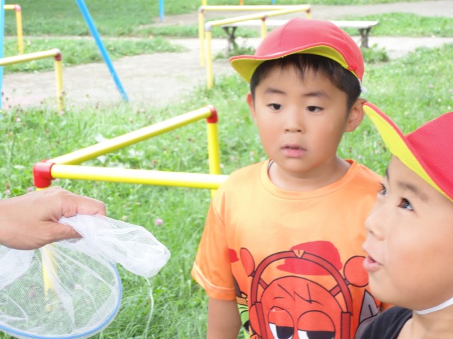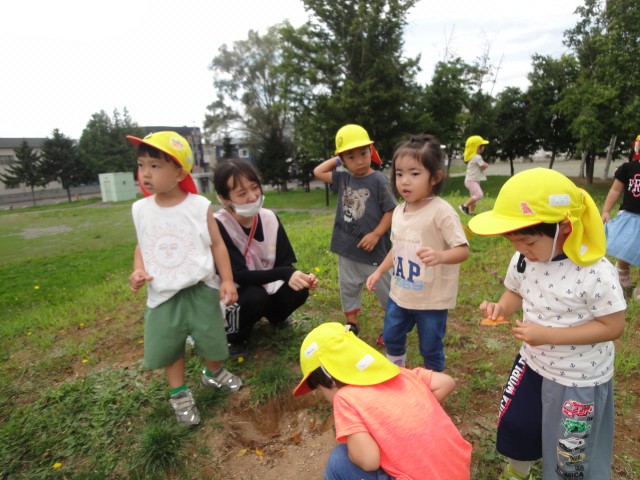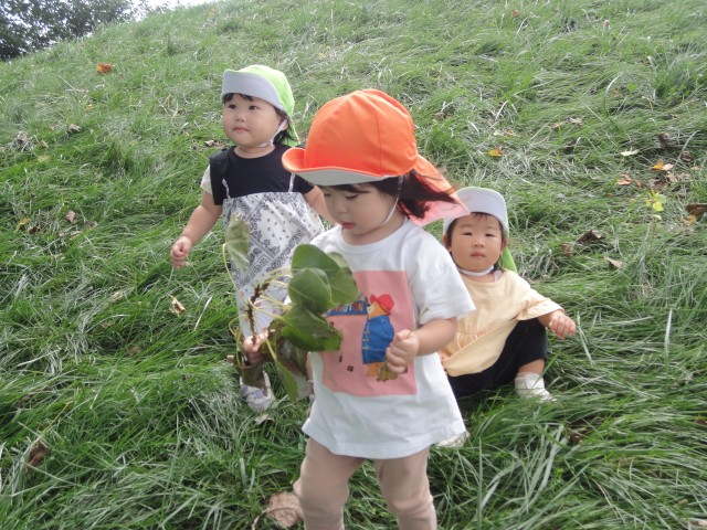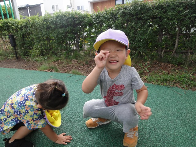 園庭にはたんぽぽさんとさくらさんが一緒に出て遊んでいました。兄弟の子も多く、あちこちで上の子が下の子の面倒をみているシーンがありました。相変わらずダンゴ虫探しが大人気の遊びです。園庭に出るとすぐにイボタの所でしゃがみ込んで探し出します。やっと触れるようになったお友だちがいて、とっても嬉しそうにダンゴ虫を見せてくれましたよ。上を見ると、クルミの木にたくさんクルミの実がなっていましたよ。今年もまたクルミが子どもたちのおもちゃになっていきますね。