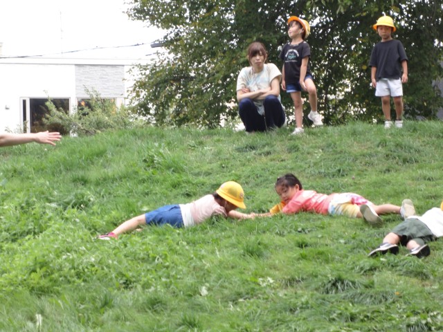 はっきりしないお天気でしたが、公園に出かけて行くクラスが多かったです。ちゅうりっぷさんは、ナスやピーマン、インゲンの収穫をしてから、すくすく公園に行きました。公園では、小山から走り下りたりゴロゴロと転がったりしていました。万歳の格好でお友だちと手をつないで転がっているお友だちがいて、いろんな事を考えるんだなぁと感心して見ていました。