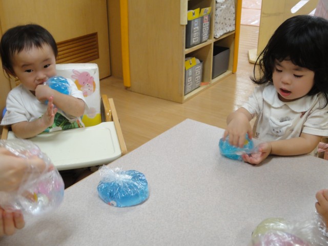 つくし組では、色水をビニール袋に入れて、感触遊びをしていました。ビニール袋は二重にしているので、破れて漏れる心配はありませんね。グニュッとつかんでみたり、氷嚢のようにおでこに当ててみたりして、冷たい感触も味わっていました。