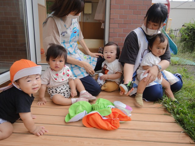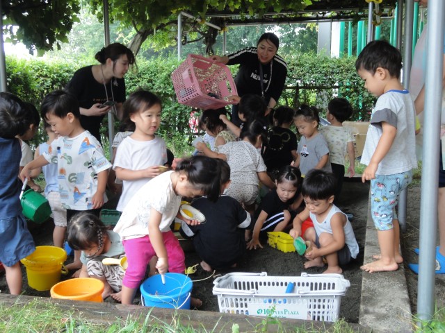下のクラスも、今日は水遊びをしました。たんぽぽさんは小さな滑り台を出してきて、上からお水を流しながら滑り台をしました。「ウォータースライダーだよ」との事でしたが、滑り台の角度が急過ぎて、一瞬で落ちてしまい思ったようにはいかなかったようです。でも、これはこれで楽しかったようで、順番待ちの列ができていましたよ。来週は9月。水遊びができるのもあと少しかもしれませんね。