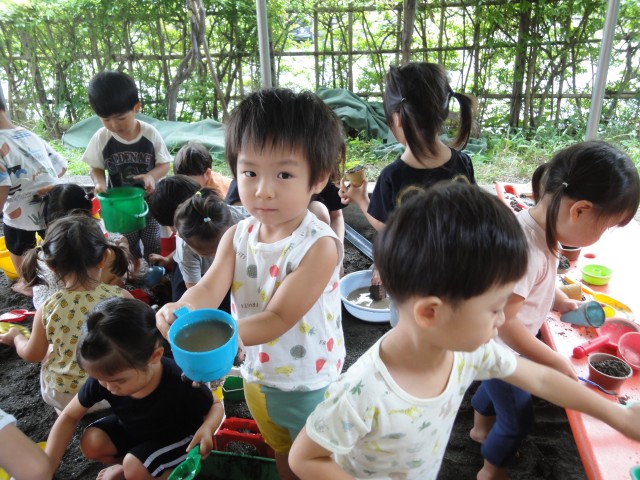 たんぽぽさんは、汚れても良いシャツとパンツをおうちの方にお願いしていたので、今日は思い切りどろんこ遊びをしました。でも、汚れるのが嫌でなかなか遊び込めないお友だちもいましたよ。そんな子たちには、色水コーナーも用意されていましたので、そちらで遊ぶこともできます。「コーヒー、ください」と言うと、カップに泥水を入れて、持ってきてくれました。お店屋さんごっこみたいで楽しかったです。