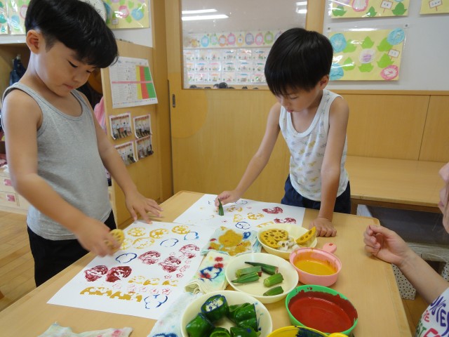すみれさんは、お部屋で爆弾ゲームをしていました。爆弾は、ぬいぐるみです。お隣からぬいぐるみが回ってきても気が付かず、ボーっとしているお友だちが少なくありません。それから、お友だちとお友だちの間で曲が止まった時は、じゃんけんで決めていました。ルールを理解するまで、もう少し時間がかかりりそうですね。ちゅうりっぷさんは野菜スタンプをしました。オクラがとってもかわいいお花のスタンプになりますし、ピーマンやレンコンはおもしろい形のスタンプになっていましたよ。