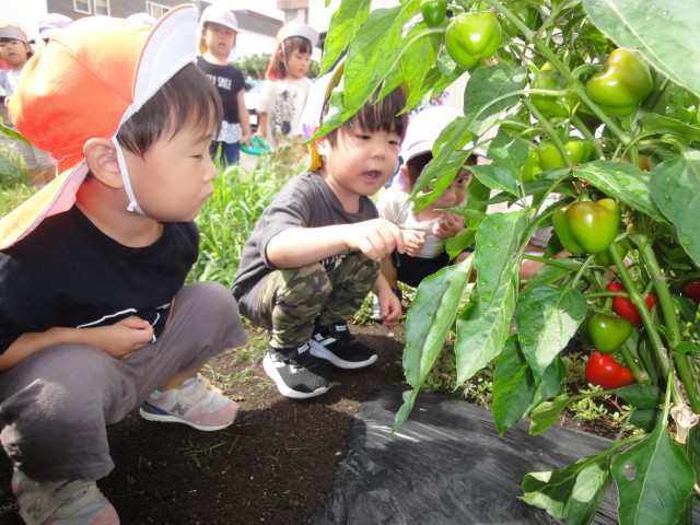 たんぽぽさんが畑にやってきました。真っ赤なパプリカを見つけ「ピーマン!」と言って教えてくれていました。お顔と同じくらい大きなナスも収穫しましたが、とっても重そうでしたよ。畑があるおかげで、野菜の事が身近に感じられ、野菜に興味を持っていくきっかけになりますね。統計的に子どもの嫌いな野菜では、ピーマンと人参が上げられますが、うちの子どもたちは好きな野菜に入っています。育てること、知ることが興味となり、おいしいと感じることができるまでになるんですよ。