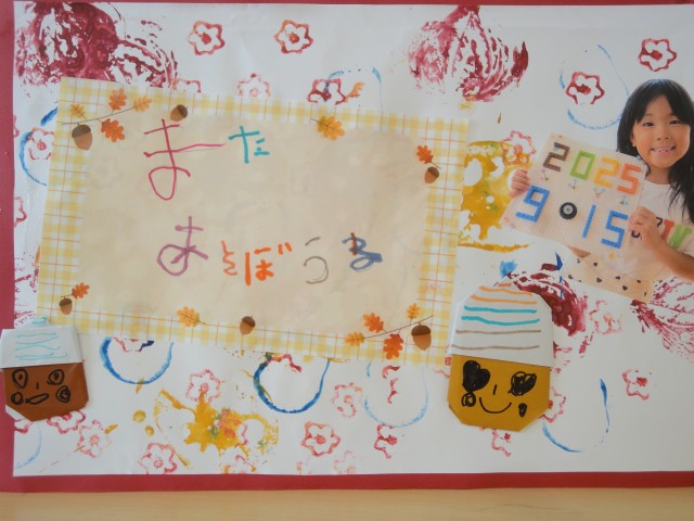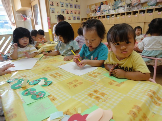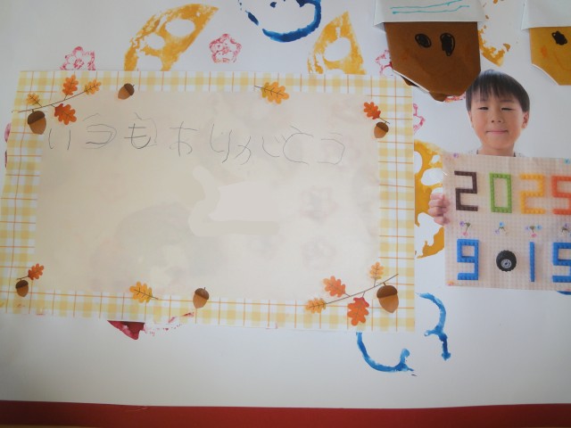 さて、今月は『敬老の日』がありますね。例年、おじいちゃんおばあちゃんにお葉書を描いて送っていたのですが、切手代が高くなってきたこともあり、今はメールやラインの時代ということもあるので、今年からおじいちゃんおばあちゃんの事を思って9月の制作をすることにしました。ちゅうりっぷさんの制作が、早々と完成しました。先日の野菜スタンプの上に、自分の気持ちを描いた手紙を載せて、写真も付けています。お手紙を書きたいという気持ちが字を覚えたりするきっかけになっています。あいうえお表を見ながら、一字一字書いていましたよ。保護者の方は、写メをお撮りになって、おじいちゃんおばあちゃんに送られてはいかがでしょうか。