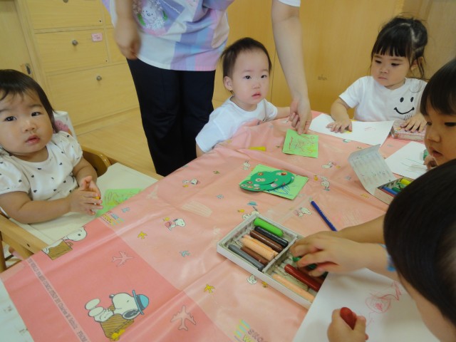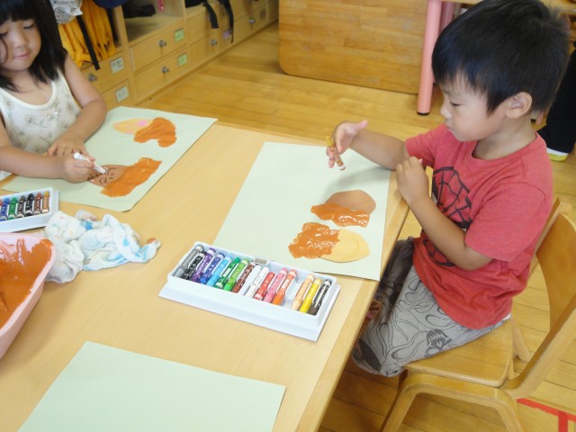 ちゅうりっぷさんでは、夏の思い出の絵を描いていました。キャンプに行ったとかおばあちゃんちに行ったとか、ガトキンに行ったとかイオンに行ったとか…お話の上手なちゅうりっぷさんなので、聞いているだけで楽しくなりました。海の絵を描いているお友だちがいましたが、水色と青を段々に塗って、海の深みを感じる絵になっていました。「花火、きれいだったよ」と花火のことを一番の思い出に上げているお友たちもいました。みんな楽しく過したことがわかりましたよ。