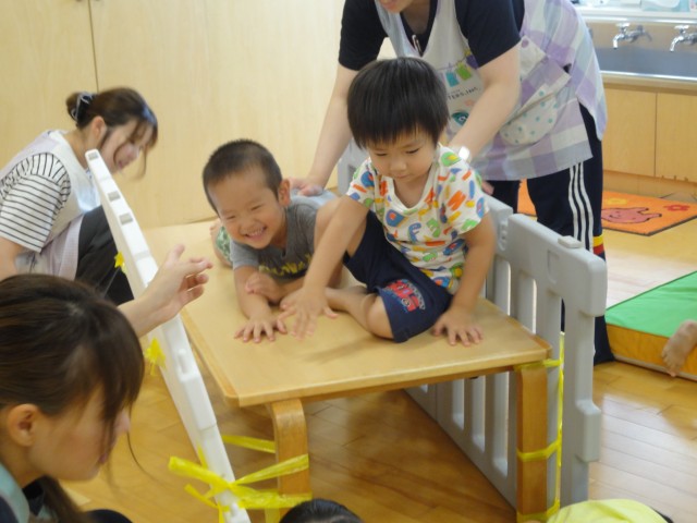 ホールではちゅうりっぷさんがサーキットをしました。跳び箱や平均台、ジャンプやハイハイなどいろんな体の動きが必要です。両足飛びでバーを倒したり、背中で進んだり、色んな事を見せてくれました。たんぽぽさんも下でサーキットをしていました。子どもたちが興味を持ちそうなものを並べていました。目新しいものが好きなので、今日はこのテーブルの下くぐり&テーブルの上を腕で進むコーナーが人気でしたよ。