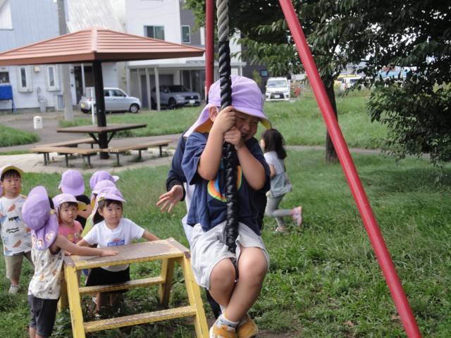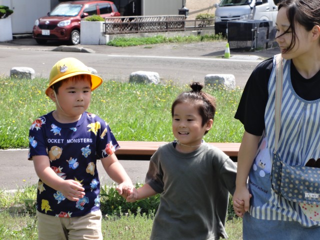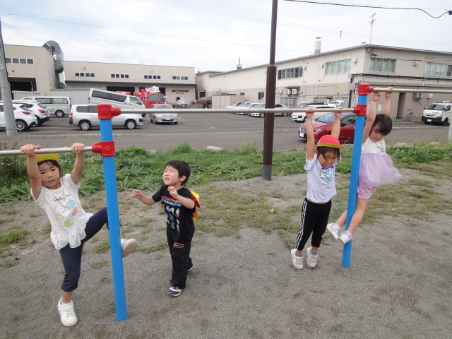 すずらん公園に行ったたんぽぽさんは、小山の上に登って「この間、ここにキツネがいたのを見たよ」「キツネはエキノコックスを持ってるから触っちゃダメなんだよ」と子ども同士でお話していました。エキノコックスという言葉を知っているのに驚きました。お母さんにしっかりと教えてもらっているんですね。賢いですね~。さくらさんは、13条大橋を渡った所にあるかりき公園まで行きました。誰もいない大きな公園で、走ったり遊具で遊んだりしてきました。鉄棒にジャンプしてつかまったり、支柱に足をかけて登って高い所につかまったりしていましたよ。こういう遊びを通じて、また手の力もついてきますね。