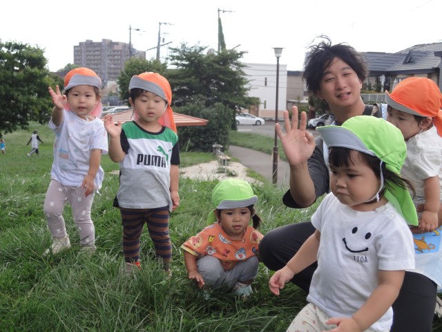 陽射しはジリジリと暑かったですが、風は秋を感じるようになってきました。今日は、お外に出かけるクラスが多かったです。つぼみさんとつくしさん、たんぽぽさんは、舞鶴公園に行きました。公園は広いので、あちこちに散らばって遊んでいましたよ。小山にはつくしさんがいて、草をちぎって上に投げ雨のように降らせたり、坂を登ったり下りたりしていました。たんぽぽさんは、奥の方にあるアスレチックの遊具で遊んでいました。ターザンロープもしっかりとロープにつかまっていられるのを見て驚きました。